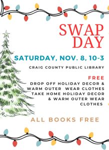 Swap Day! Nov. 8th Sat., Nov. 8 from 10a-3p Bring your old but usable holiday decor and winter clothes, and take home some new-to-you!